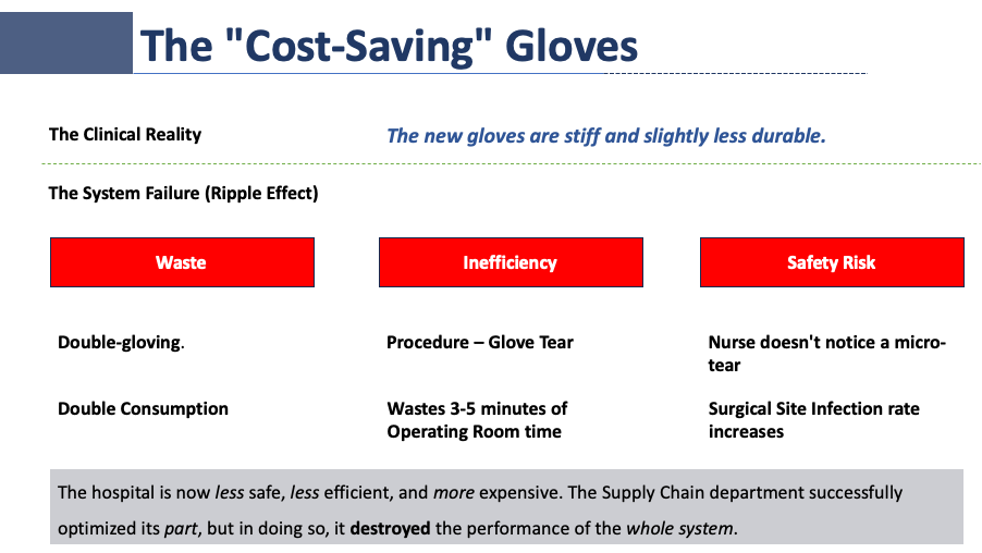 Two weeks later, the new gloves arrive in the Operating Room. The reality of the “system” begins to push back against the spreadsheet.